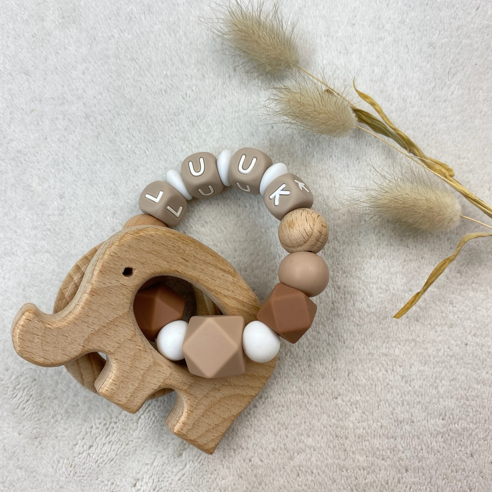 Bijtring met naam ~ Beige choco
