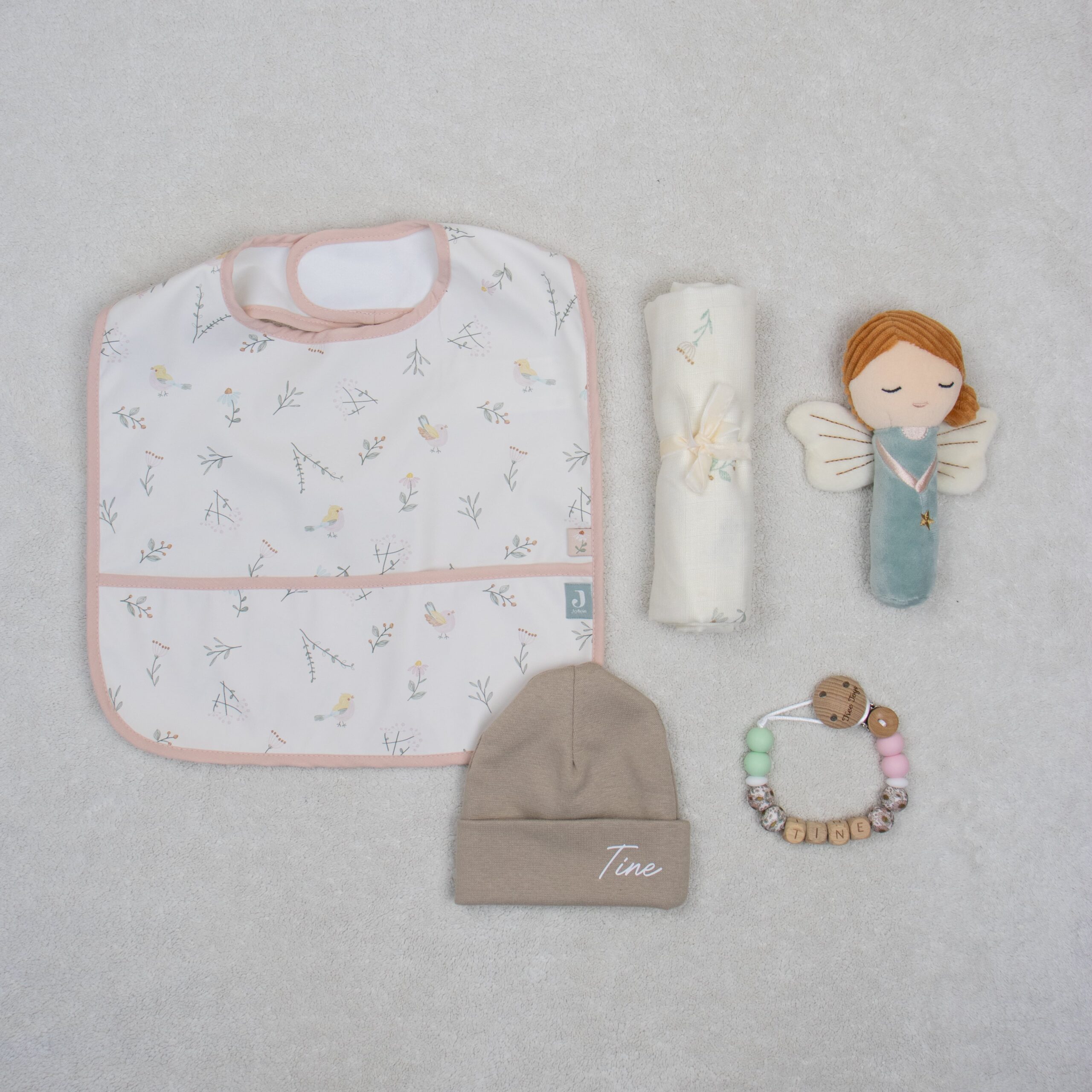 Optionele uitbreiding: Speenkoord, bijtring & muts met naam – Kies ervoor om dit pakket nog specialer te maken met een gepersonaliseerd speenkoord. Handig én stijlvol!