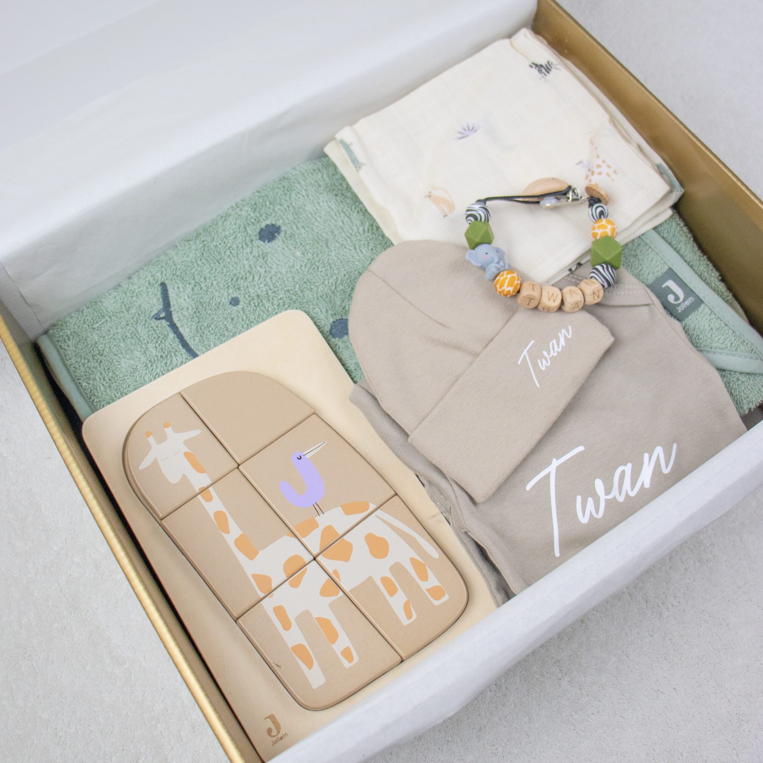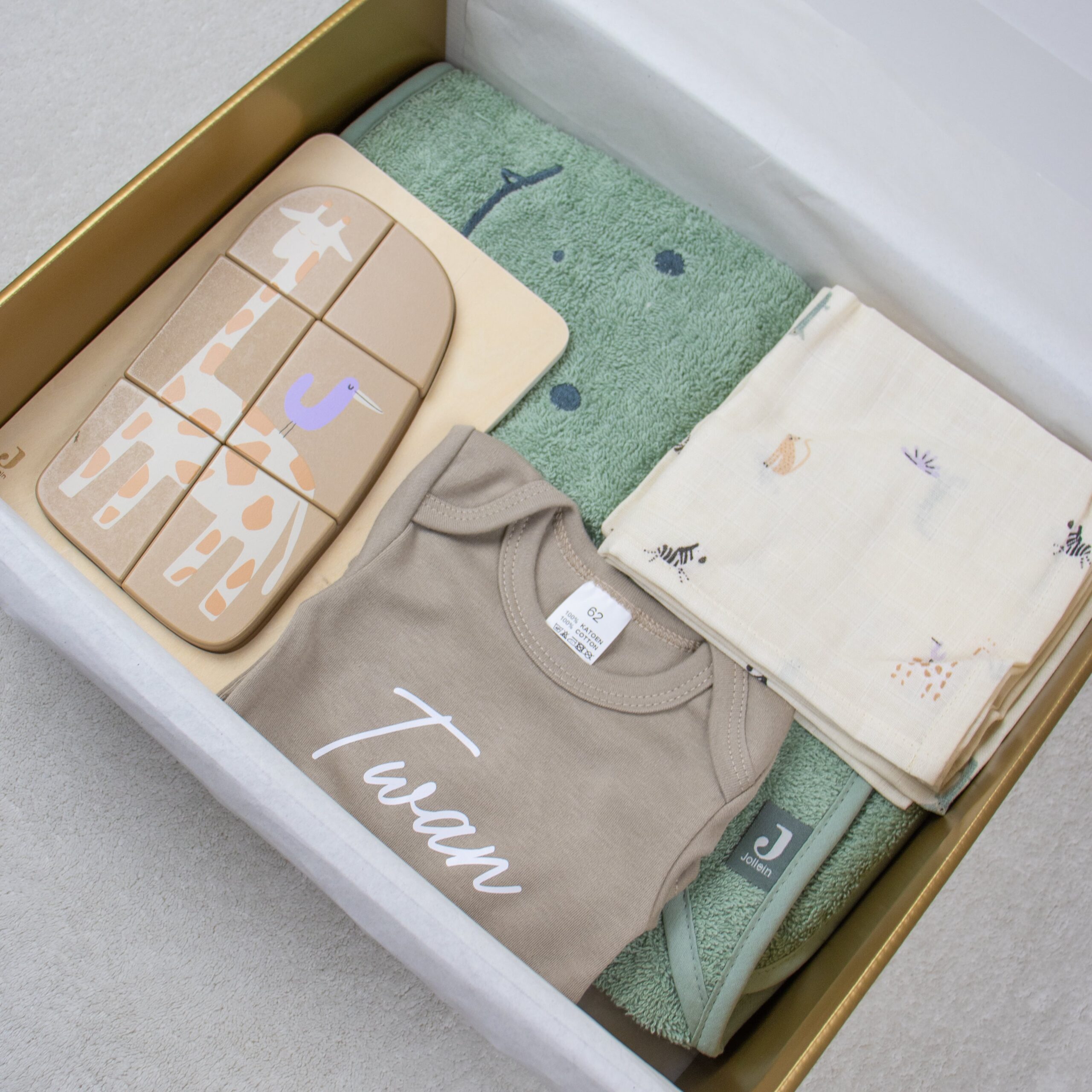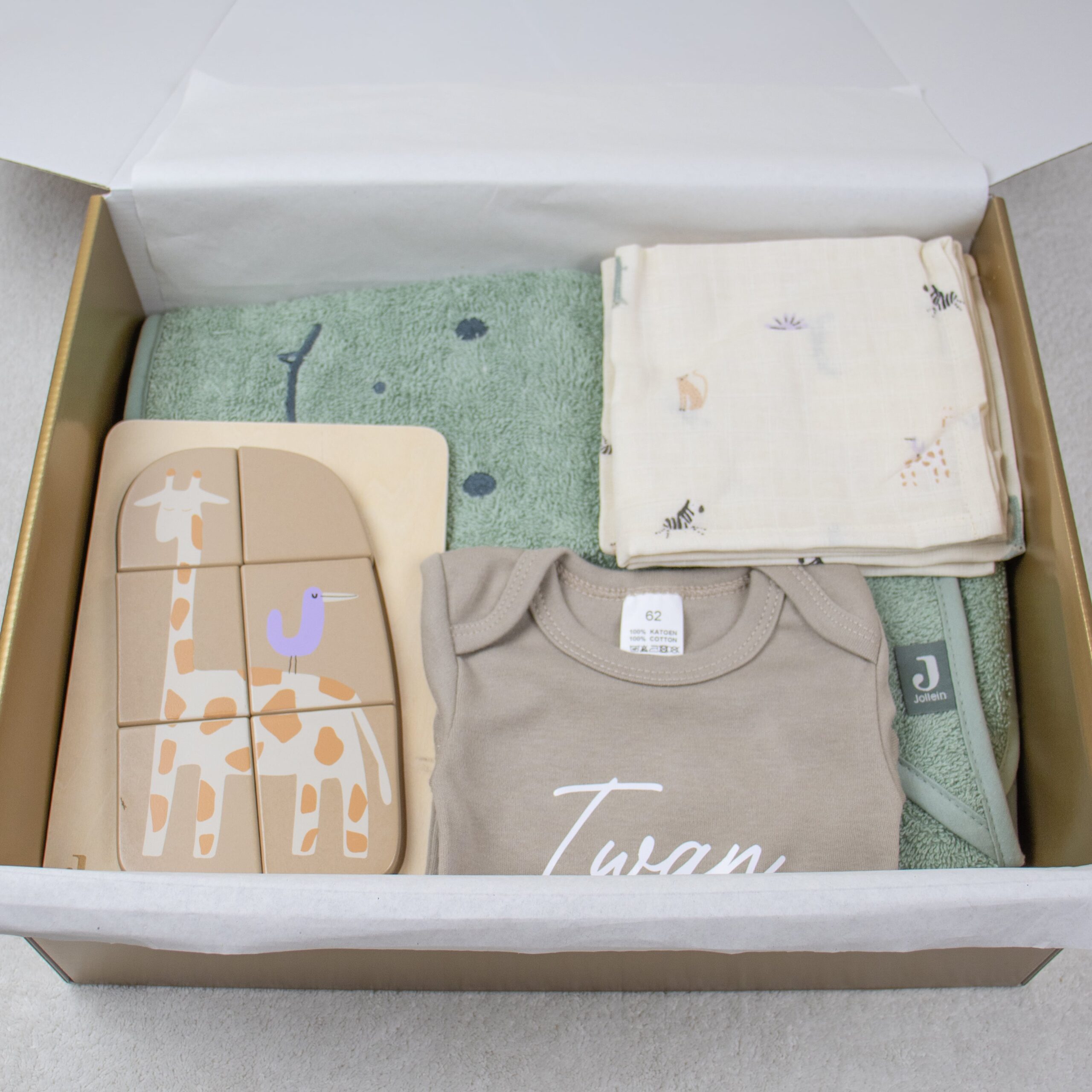 Een stijlvol en compleet kraamcadeaupakket in het Jungle thema, perfect als babyshower cadeau of geboortegeschenk.