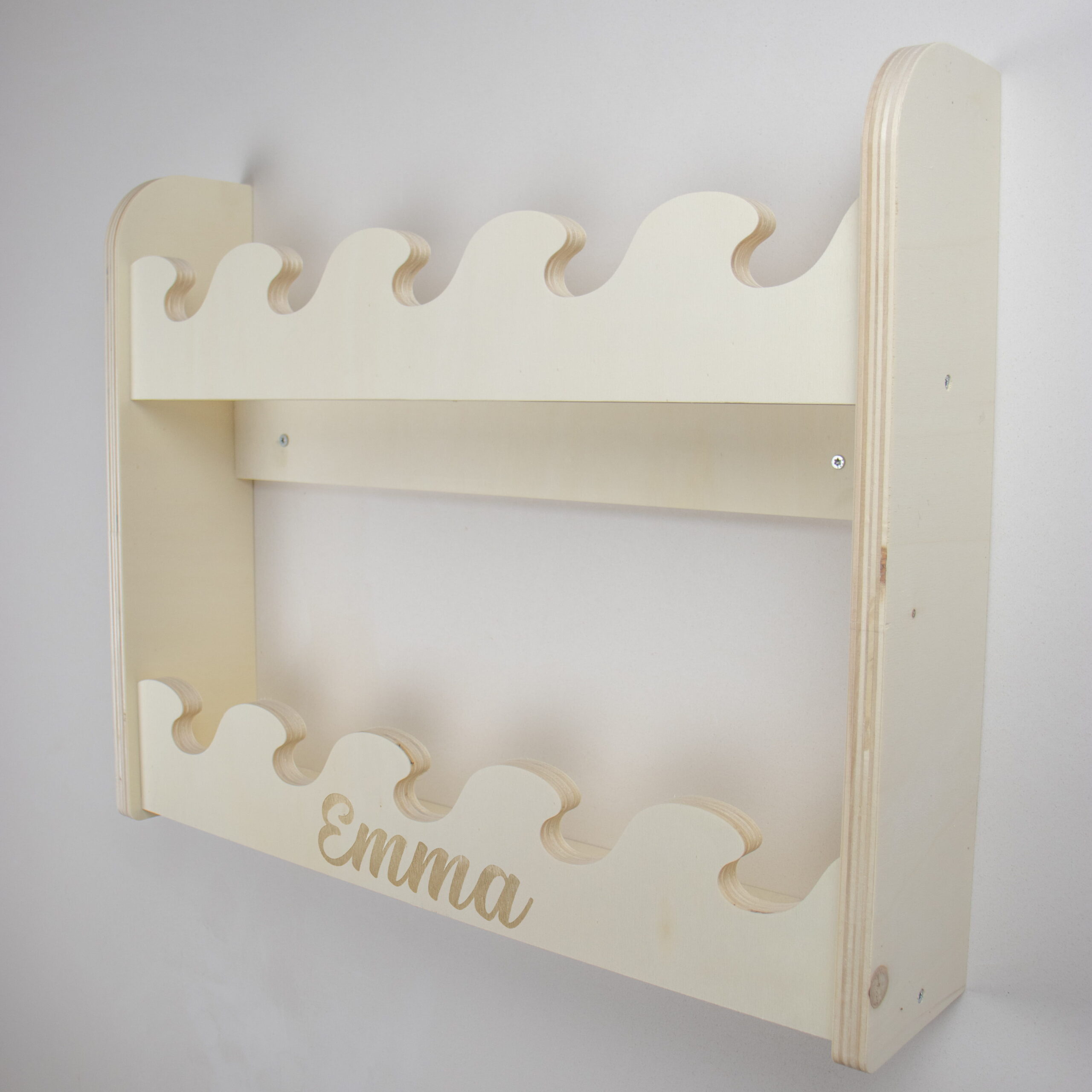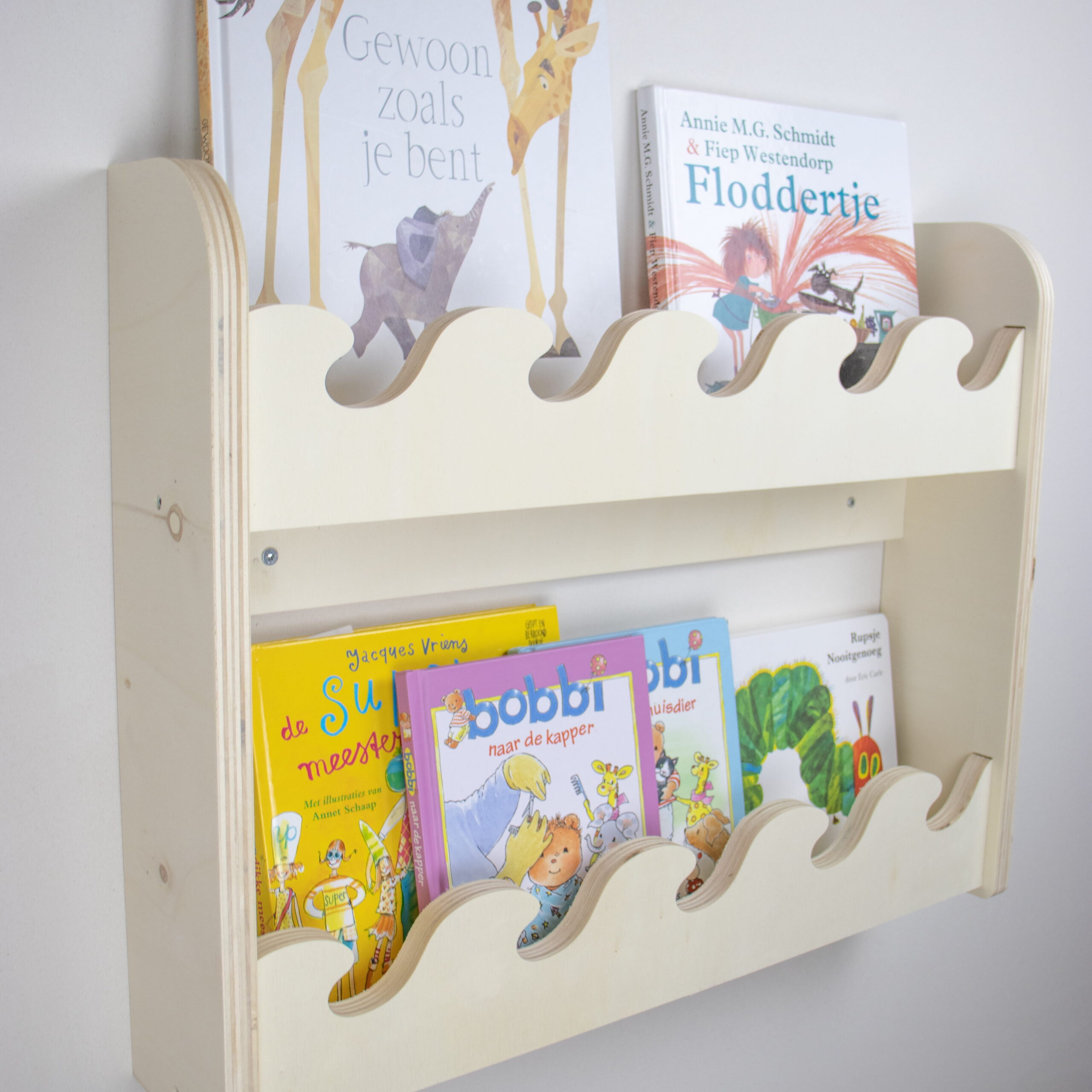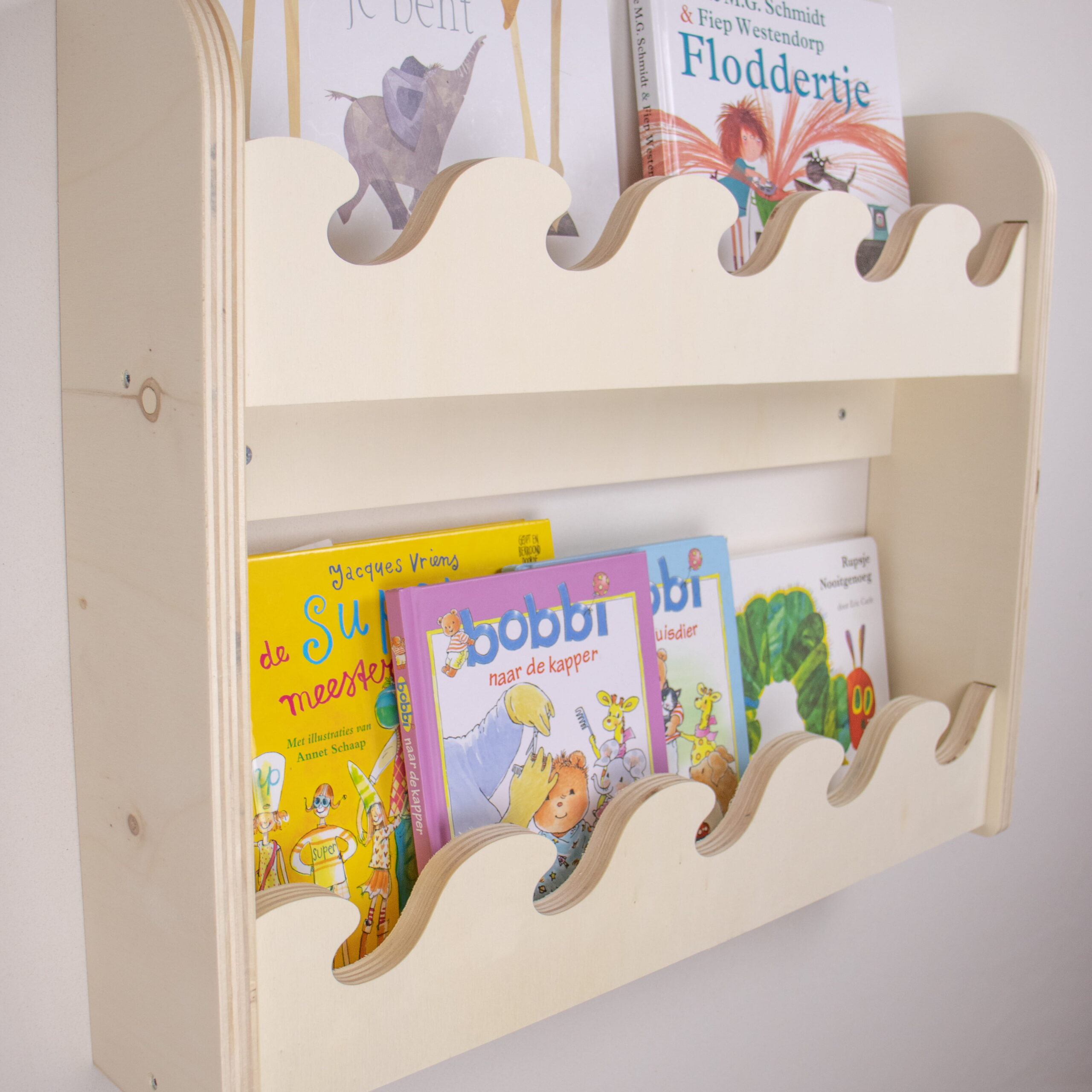 Dit houten boekenrek kinderkamer met golfdesign en 2 lagen biedt extra ruimte voor favoriete kinderboeken. Handgemaakt van duurzaam hout en optioneel verkrijgbaar met naam. Perfect voor de babykamer of peuterkamer in Montessori stijl.
