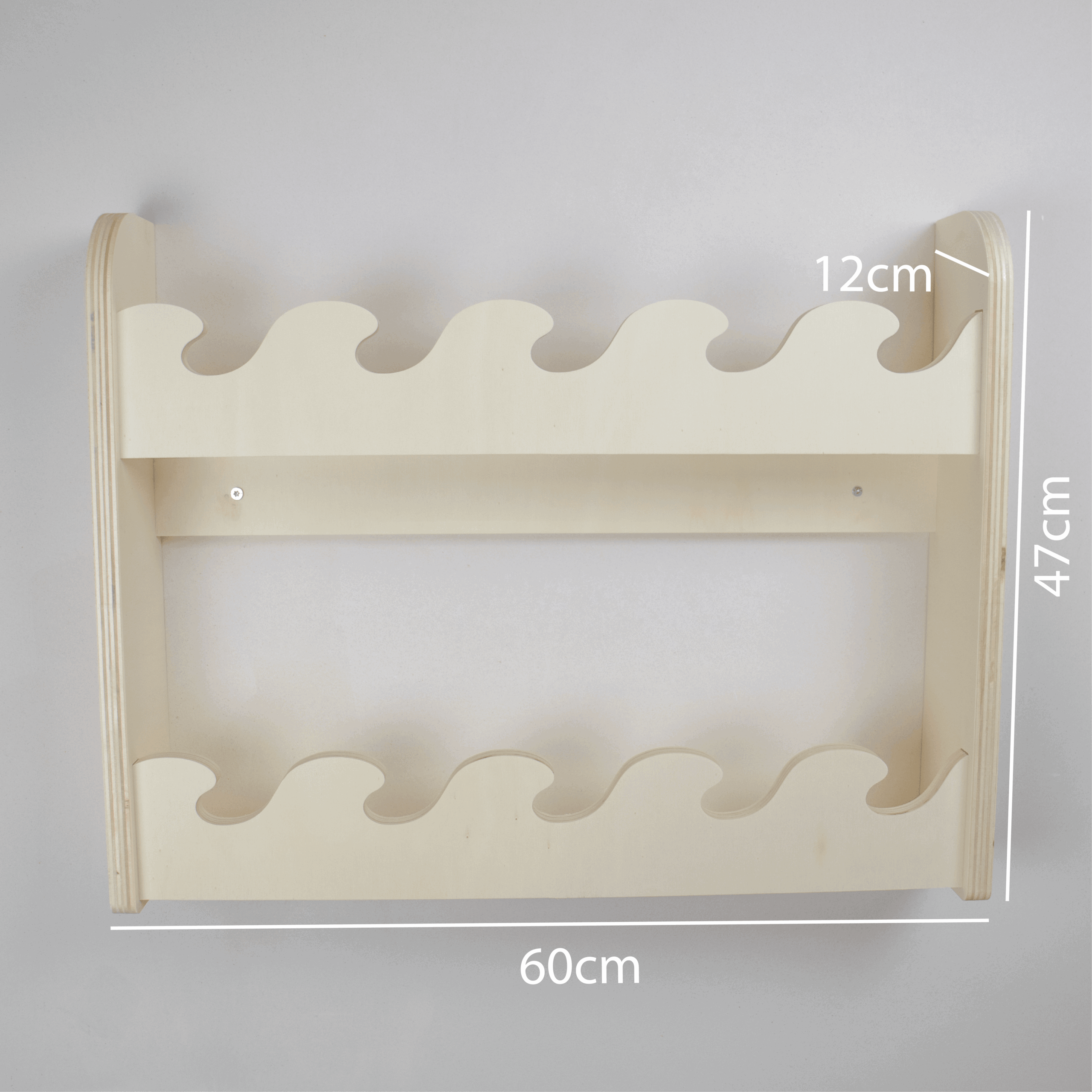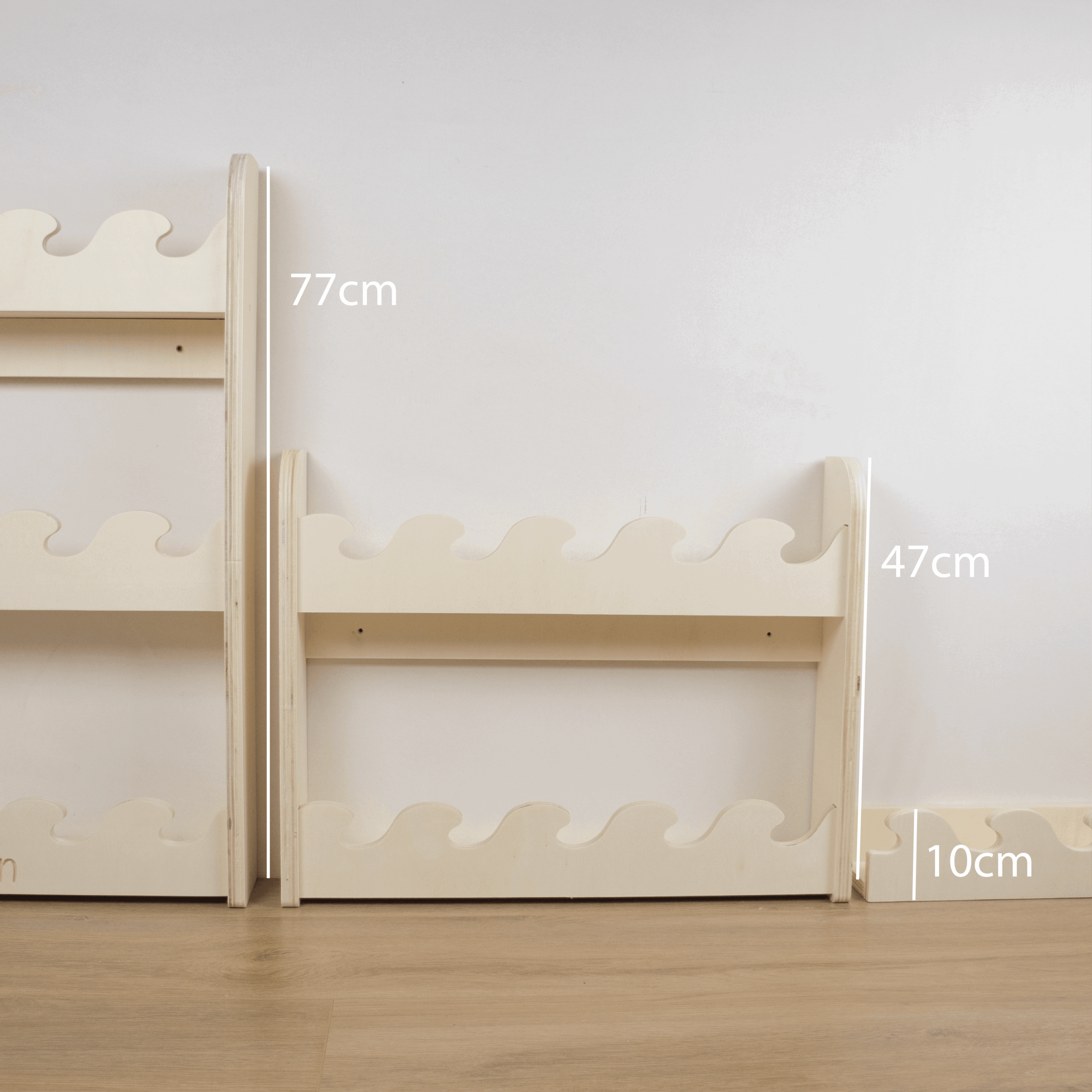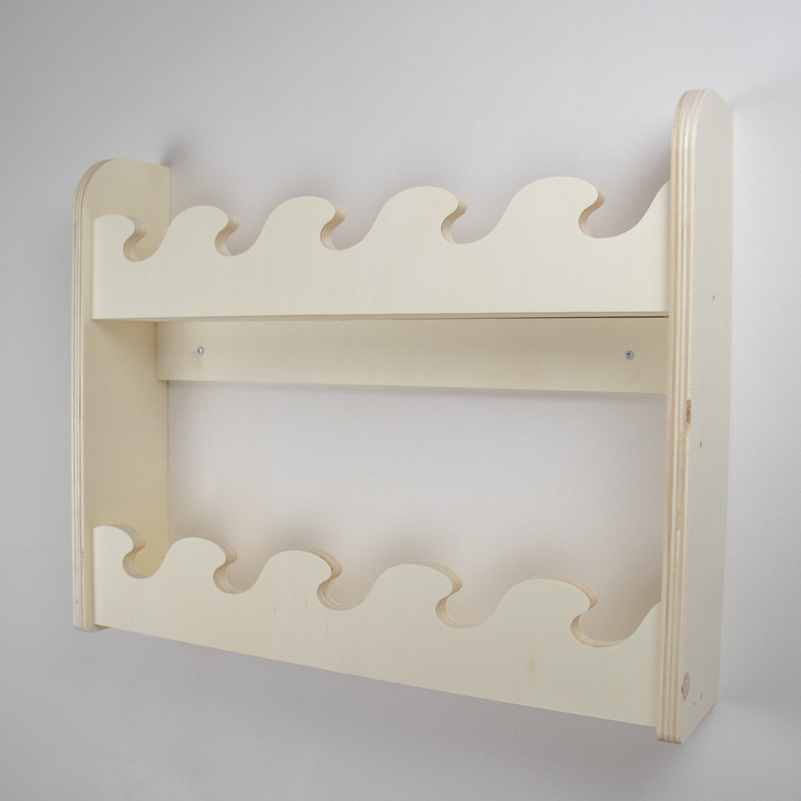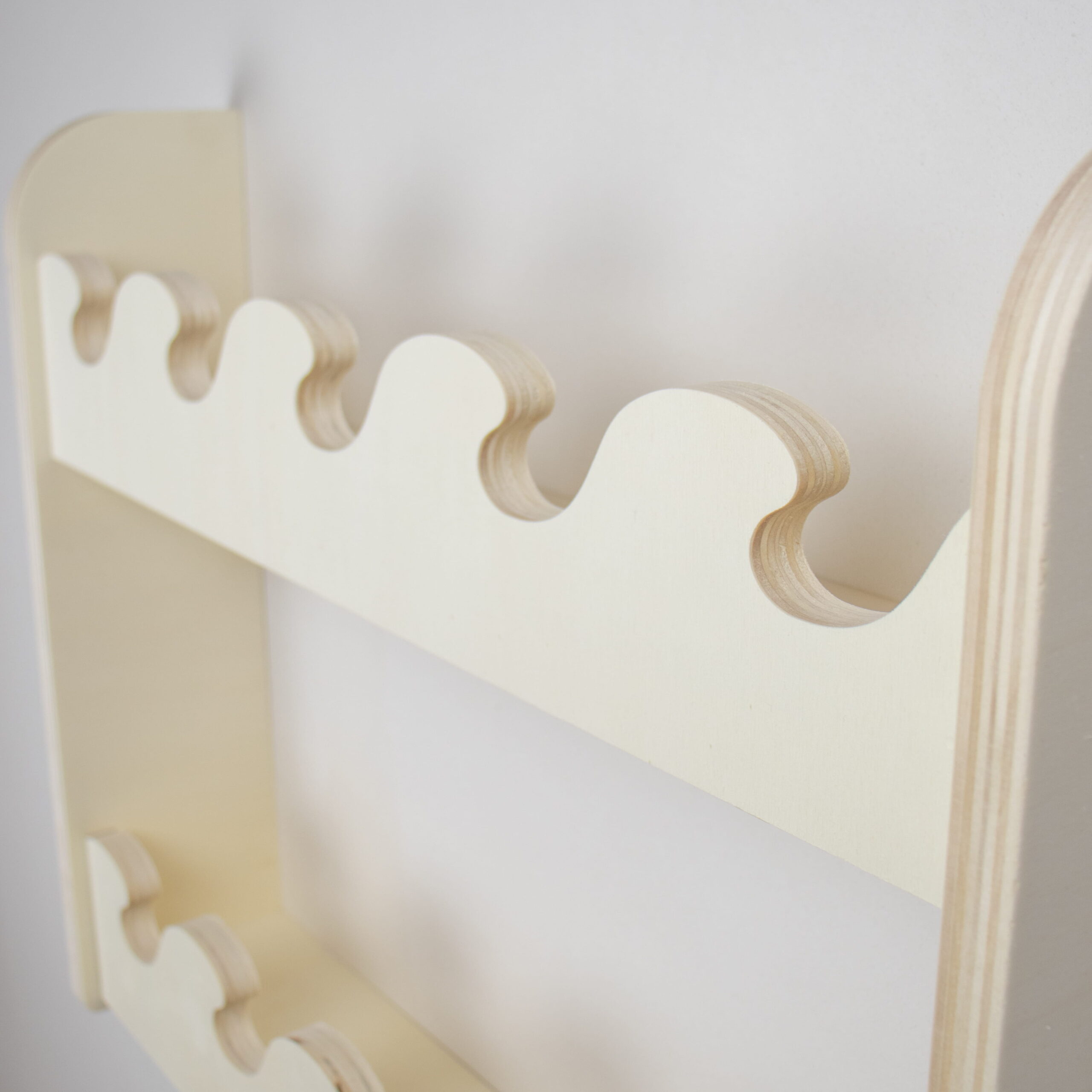 Dit houten boekenrek kinderkamer met golfdesign en 2 lagen biedt extra ruimte voor favoriete kinderboeken. Handgemaakt van duurzaam hout en optioneel verkrijgbaar met naam. Perfect voor de babykamer of peuterkamer in Montessori stijl.