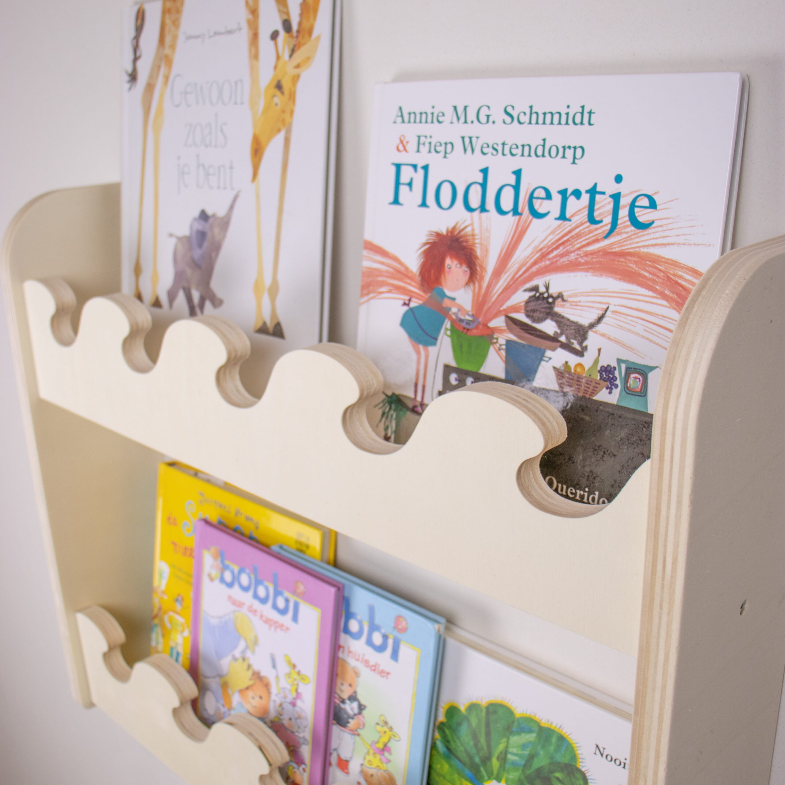Ook als boekenrek babykamer is dit rek perfect voor de eerste voorleesboekjes en kleine decoraties.