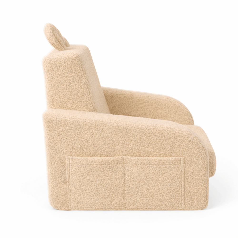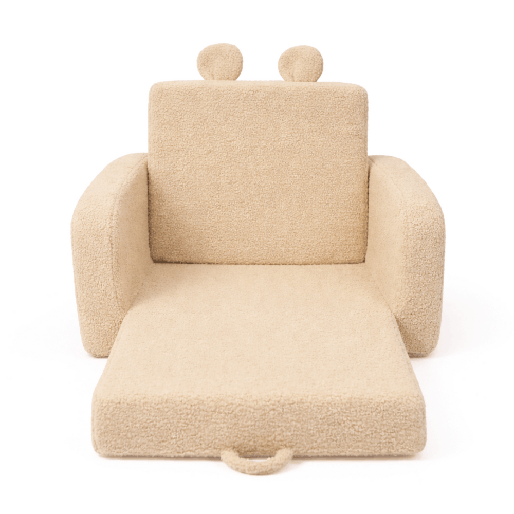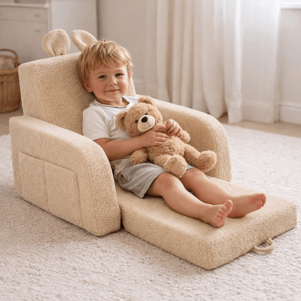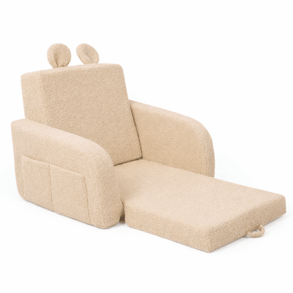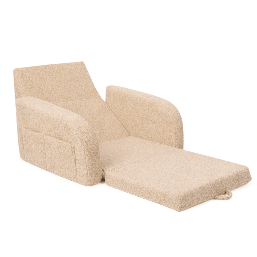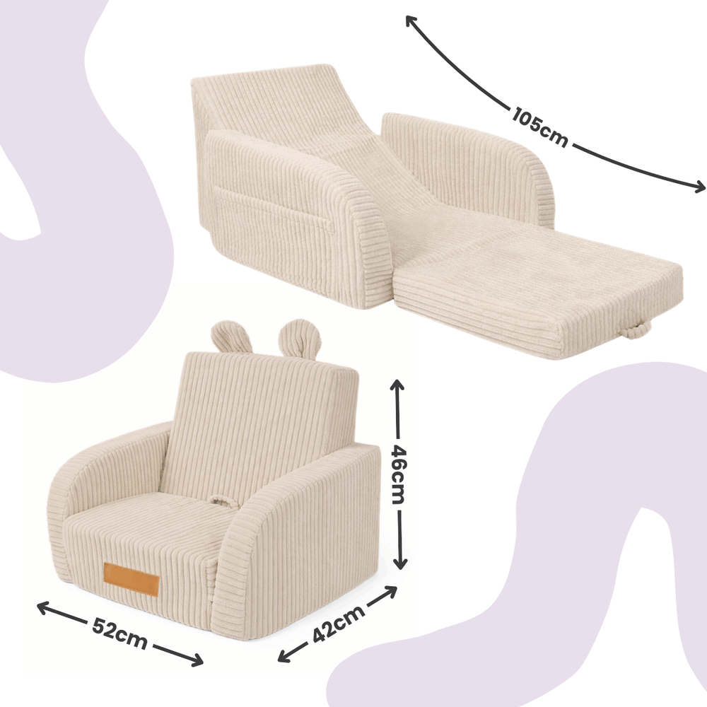 Deze uitklapbare kinderfauteuil voor peuter combineert stijl, comfort en functionaliteit. Ingeklapt is het een fijne kinderstoeltje voor een kind, en uitgeklapt verandert hij in een comfortabele lig-of speelplek.