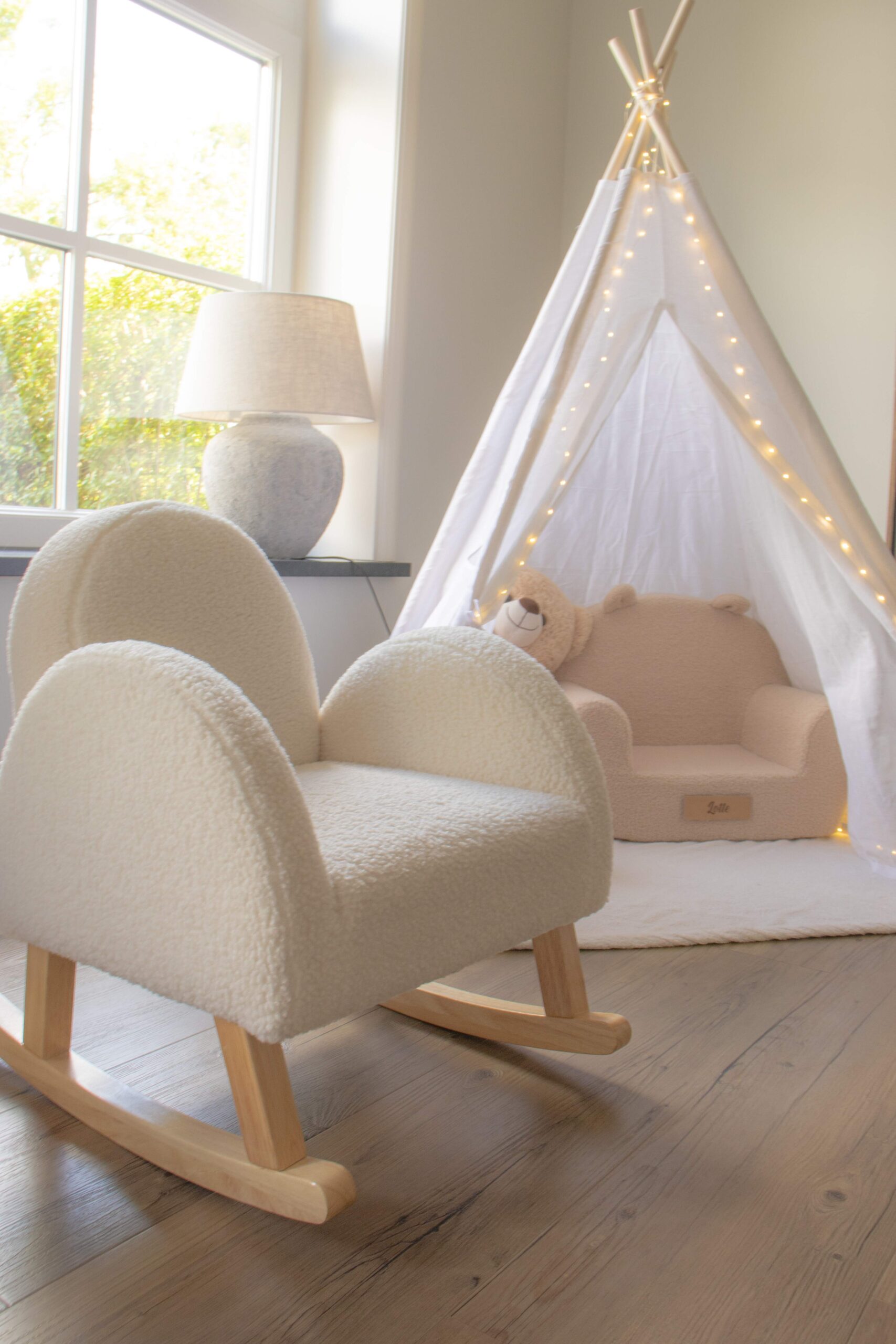 Ben je op zoek naar een schommelstoel voor baby of peuter die niet alleen heerlijk zit, maar ook de aandacht trekt? Deze zachte teddy kinderfauteuil met houten onderstel is compact, stevig en perfect voor kleine kinderen. Ideaal om in te relaxen, te schommelen of boekjes te lezen – en dankzij de personalisatie een echte eyecatcher.