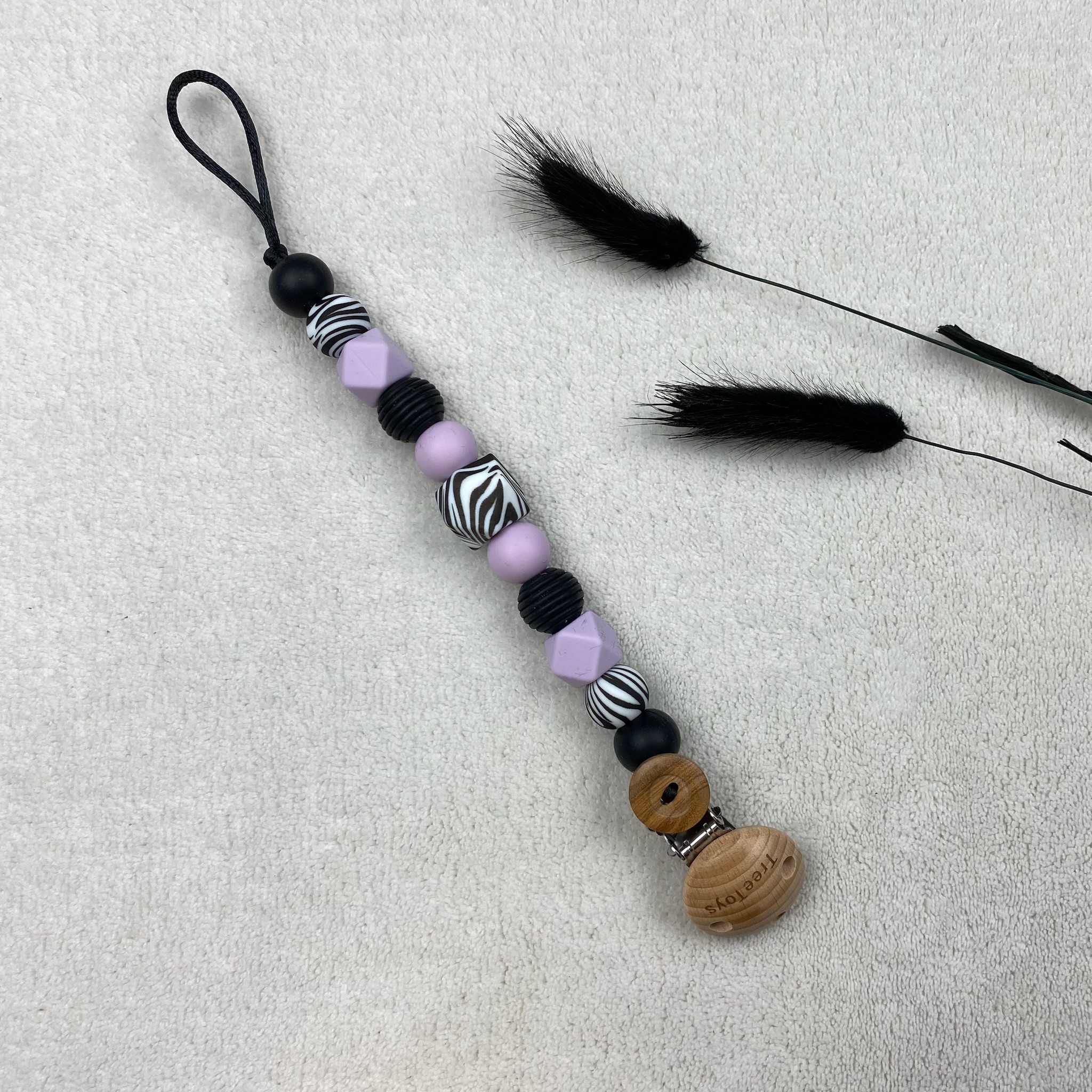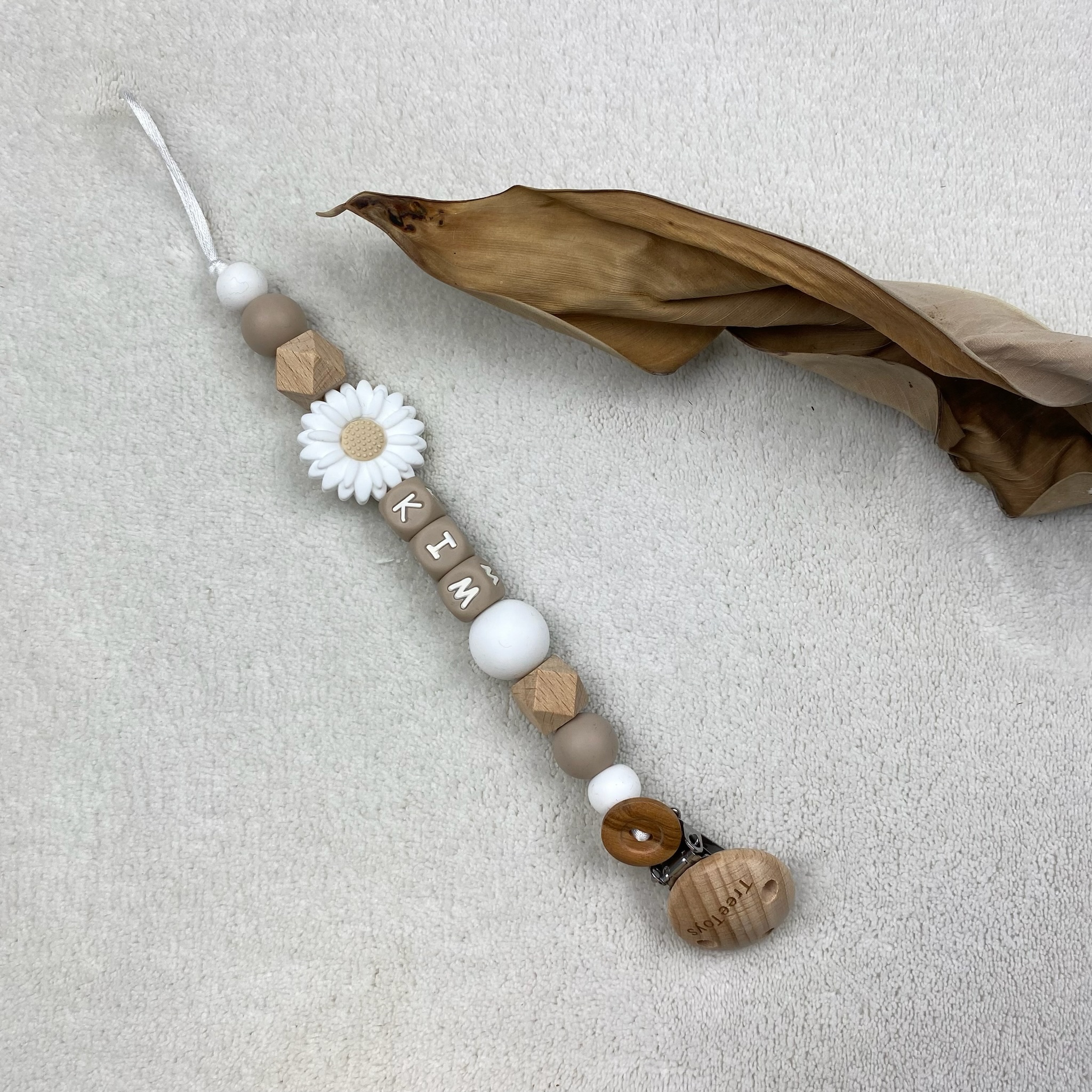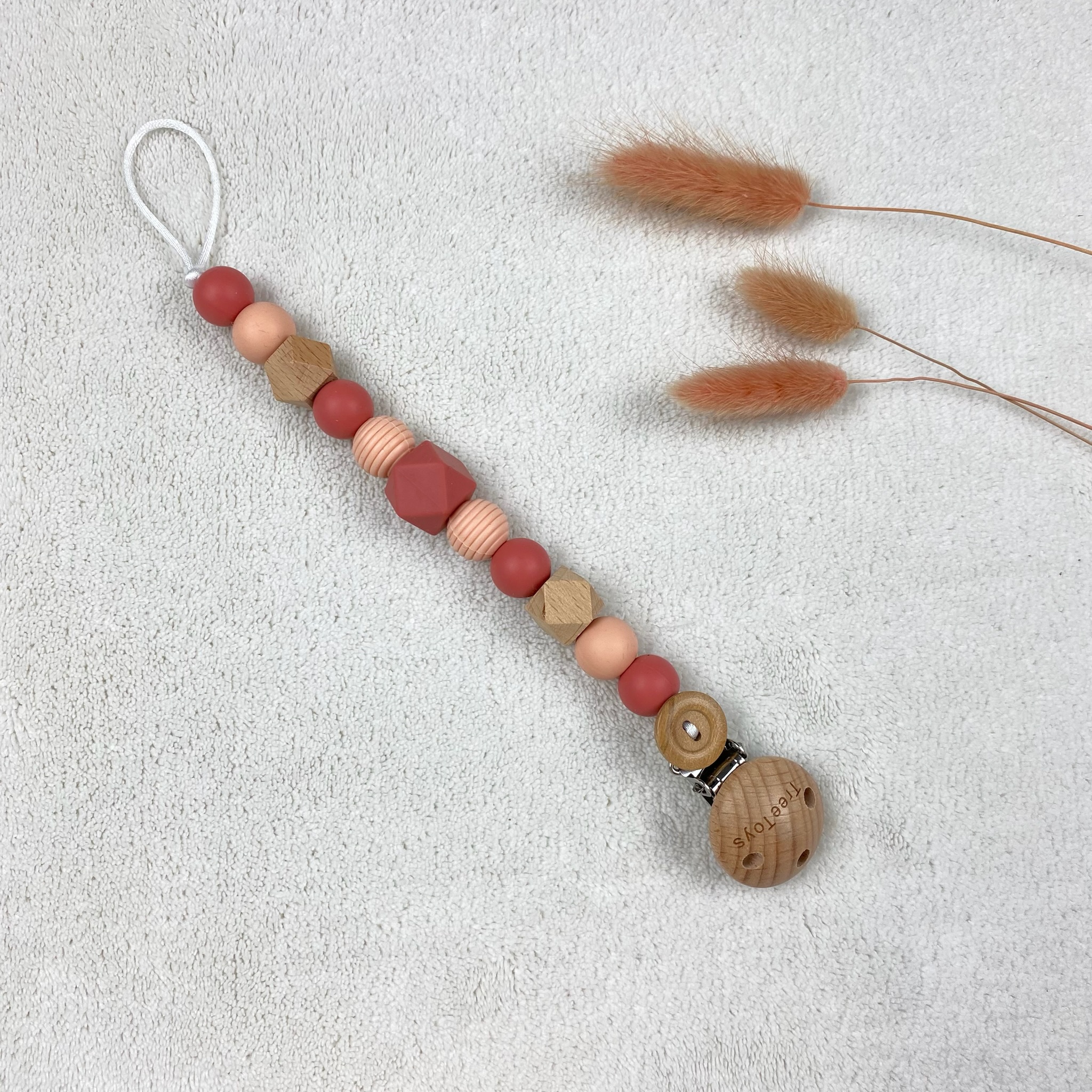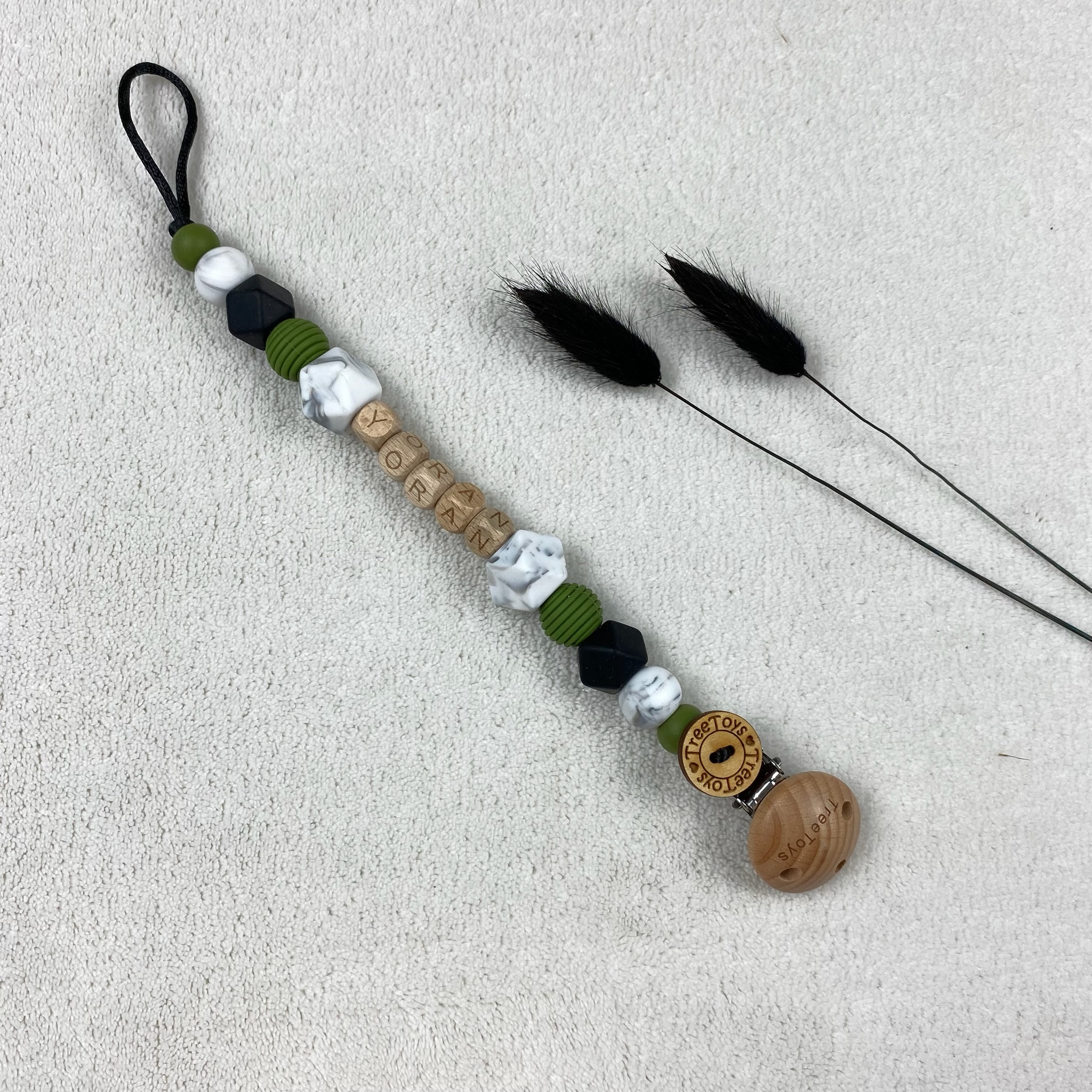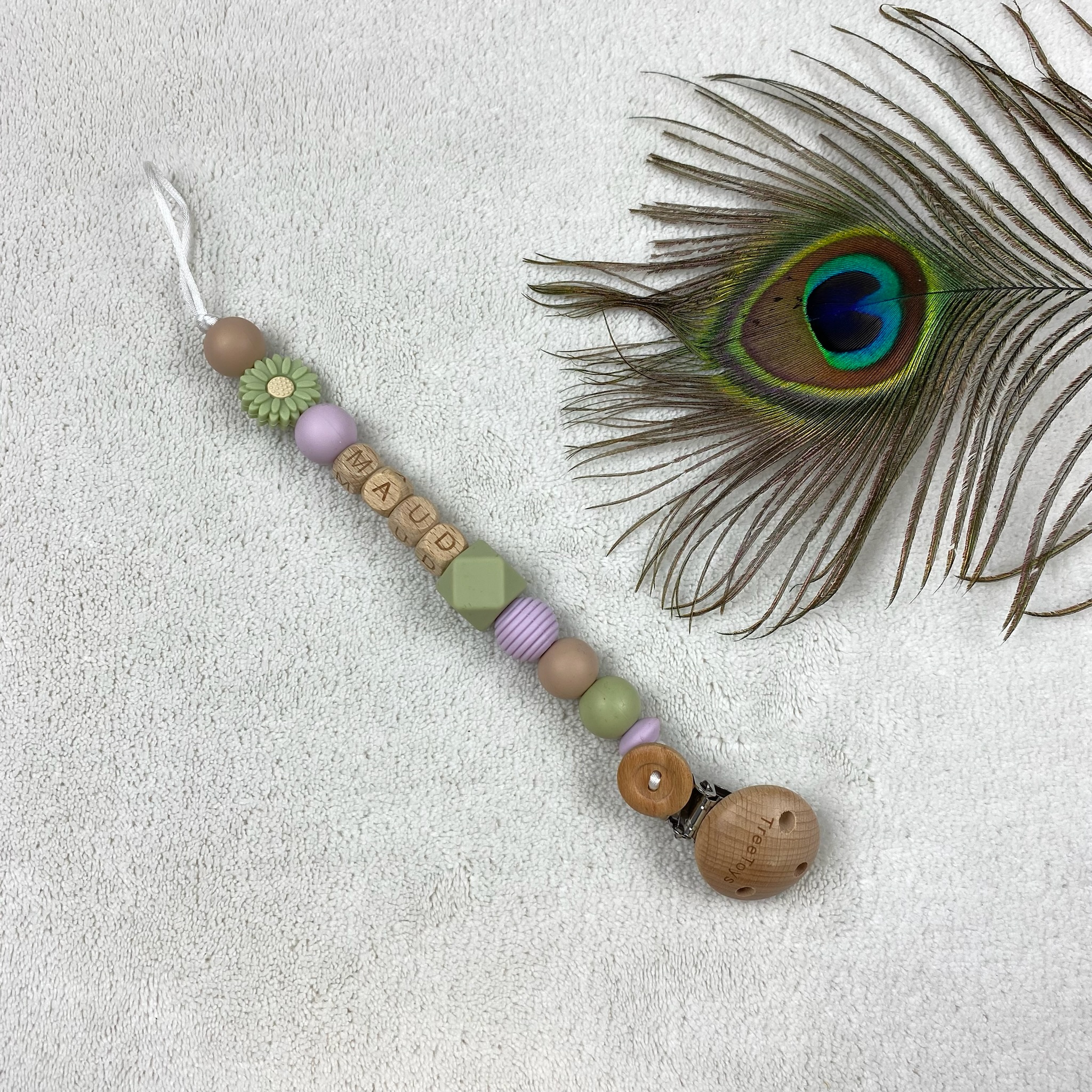 Dit speenkoord wordt handgemaakt van satijnkoord, siliconen kralen, beukenhouten kralen, letterkralen en een houten clip.